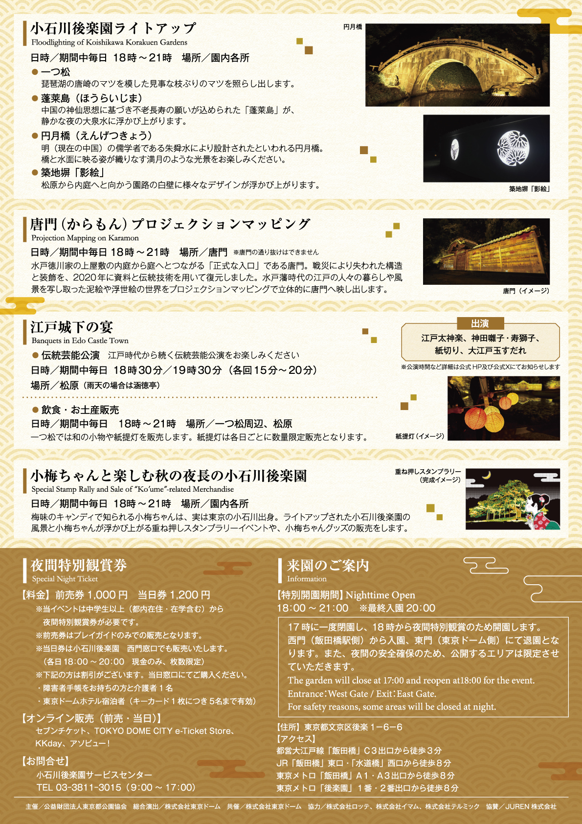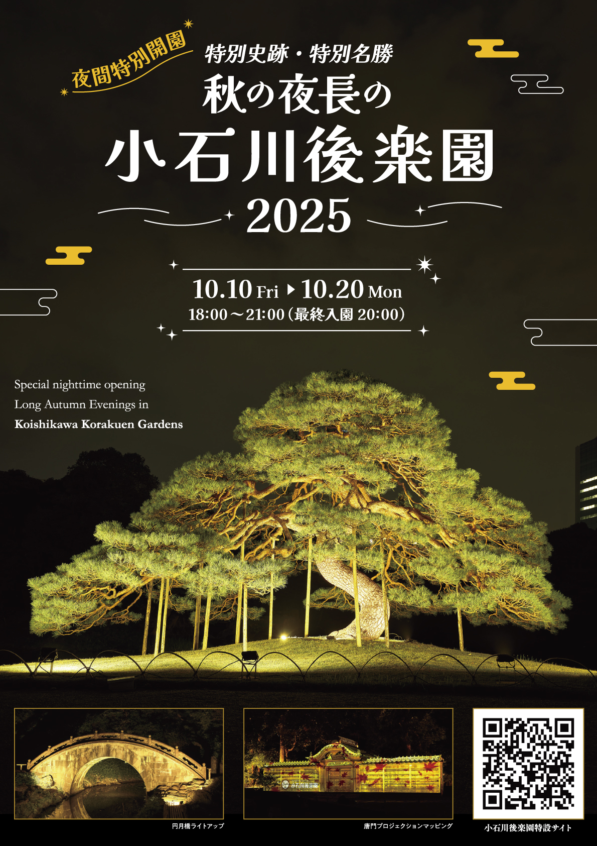 小石川後楽園にて、「秋の夜長の小石川後楽園」が2025年10月10日(金)~20日(月)まで開催されます。